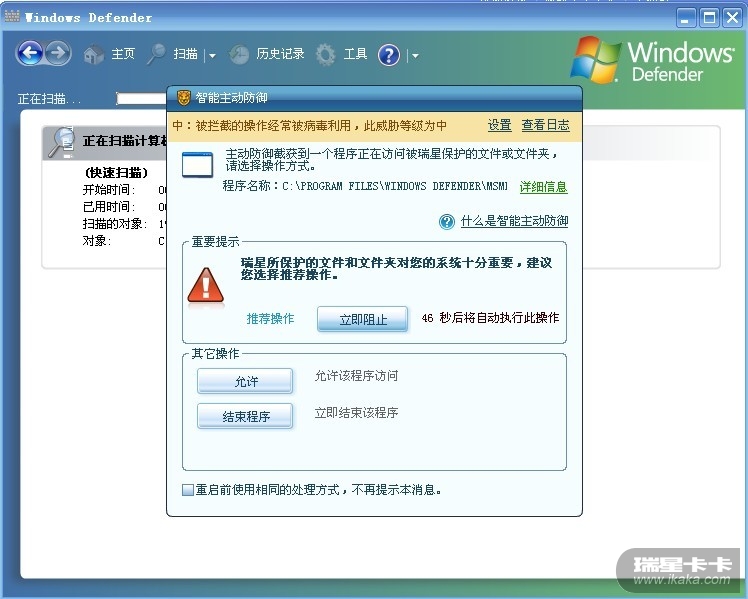 其实 Defender 加入 Rav/RIS 白名单后仍被 Rav/RIS 告警的情况由来已久,早在 Rav2009 基础版本发布时我们就已向 Rising 反馈过此问题,有关问题在 Rav2009 稍后的增量升级版本里获得较大改进,告警已仅限于 Defender 扫描 hosts 文件时。现又重新频繁告警,需要 Rising 重新检查产品内嵌的甄别条件或监控触发逻辑是否出现了错误关联等问题。