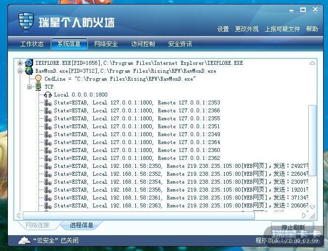 打开瑞星防火墙发现是c:\program files\rising\rfw\ravmond.exe一直在访问网络