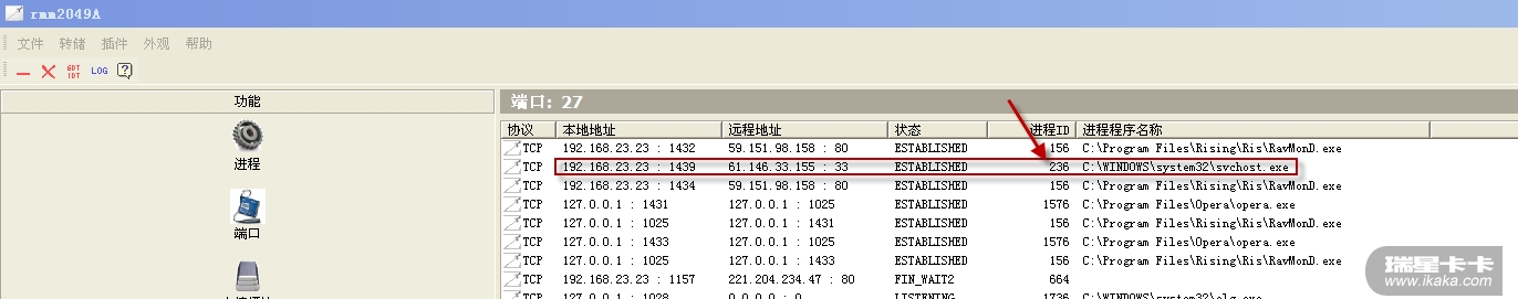 3、在“进程”列表中根据刚才记下的PID找到病毒模块插入的svchost进程,核实一下(内有病毒模块)。用IceSword结束此进程。