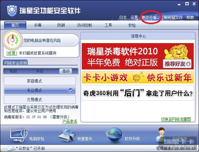 买的是瑞星07正版,平时已升级到09最新界面,可近日重装系统导致重装瑞星,从2007年1月1日起开始升级,升级完成后,界面却仍然是07版的,可界面下方显示升级日期就是今天,版本也是最新的,这是怎么回事啊?请高人指点