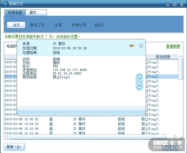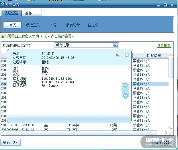 请问楼主是直接上的网还是接入了局域网?这种情况是有大量的IP在PING入,有可能是别人对你发出了攻击,不过都被瑞星拦截了,是安全的,建议楼主查下是哪个IP在PING入