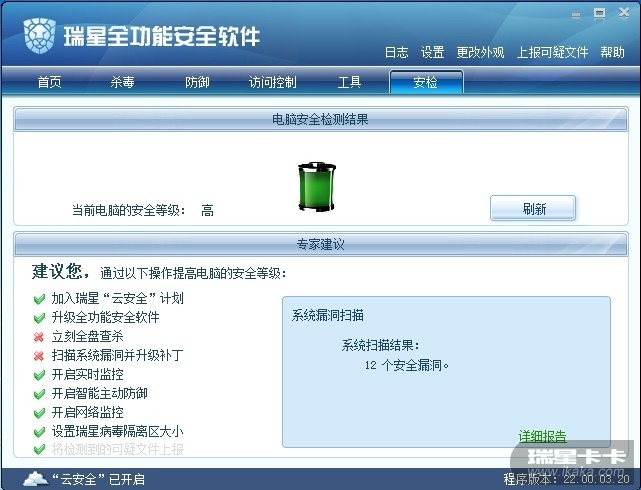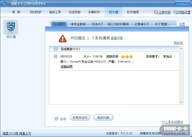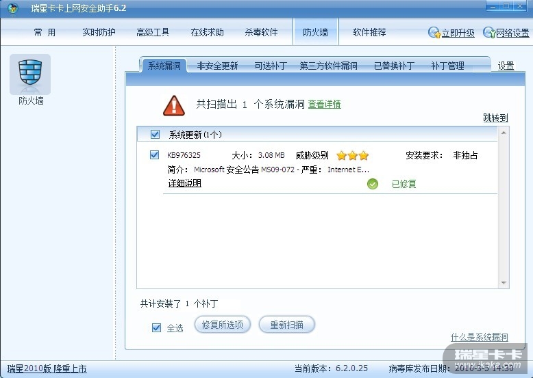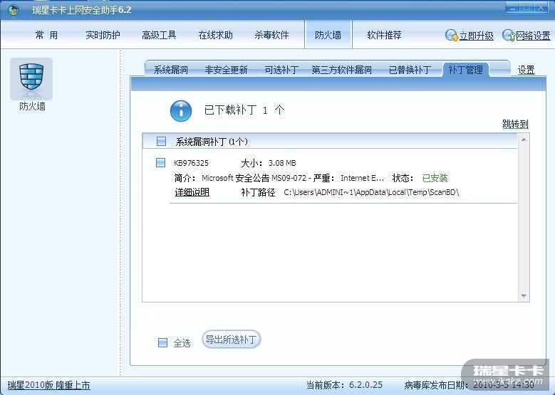 现在不管卡卡是不能够将补丁打上,现在是有关全功能的扫描问题。瑞星应该注意一下。