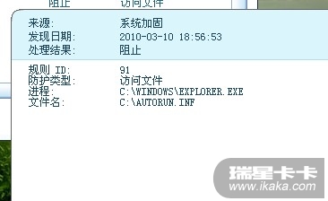 就算没有autorun.inf文件,系统自身的桌面进程也是会执行访问autorun.inf文件的命令的,2010瑞星的主动防御会常规性的阻止其访问autorun.inf文件的企图,并记录日志,哪怕没那autorun.inf文件,也一样阻止一次并记录日志。 也就是阻止并记录一次桌面程序的访问autorun.inf文件的命令。