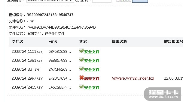 您上报的是7.RAR这个压缩包,压缩包内共有5个文件,其中1个文件是病毒,最新版的瑞星能够查杀此毒