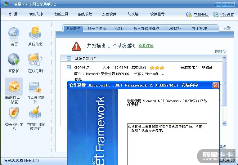 卡卡提示有一个漏洞,我先是用卡卡自动修复,可是重启后还是提示有这个漏洞,然后我手动更新,提示的是“此计算机上没有安装本软件更新支持的产品,单击取消退出安装程序”