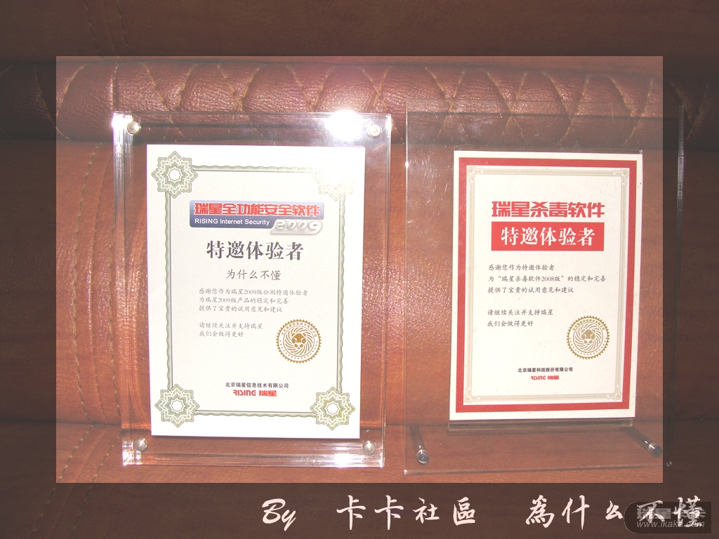 先来张部分东西的合影吧。左上:一个背包,记得当时连续收到两个,应该是上报病毒得来的吧,具体怎么来的忘了,一个送给某人了,另一个现在留着装些小杂什挂墙上。中上:两块特邀嘉宾者,下面详述。右上:两只卡卡狮,总共不只,包括后面详细拍的一只最开始的狮子,还有一只豪华霸王狮,部分都不知道给谁或扔哪了。左下与右下:四张杀软盒装版,具体不止这么多,应该都丢了或藏在某个不为人知的地方,反正昨晚找不着。中下:大盒的是公测得奖的,忘是是公测哪一版本的了,应该是05或06,一个路由器。上面的东西下面再详述。