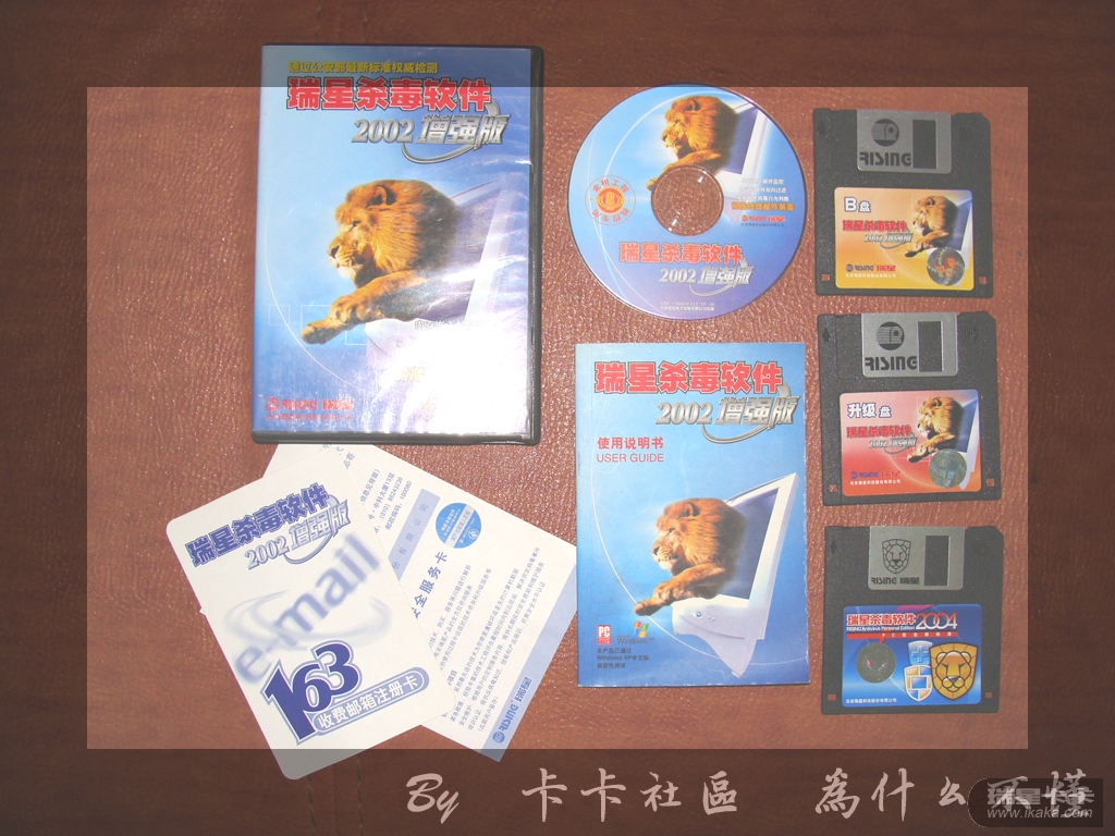 2002增强版,我最早的瑞星产品之一,还保存得基本好好的,就丢了一块软盘——A盘,当时A盘的背面是系列号,ID号则是自己另外记录的,没在产品里,后面可能重装的时候拿A盘出来输系列号,一次两次地就把A盘搞丢了,还有一个软盘是2004版用的,可惜2004的都找不着了,就剩一个软盘。至于其他的,有的自己买的,有的瑞星送的,丢了几盒,剩这几合昨晚从仓库翻出来的,其他的懒得再翻找了,因为每次都把系列号和ID记录在瑞星通行证明后,盘就扔了。