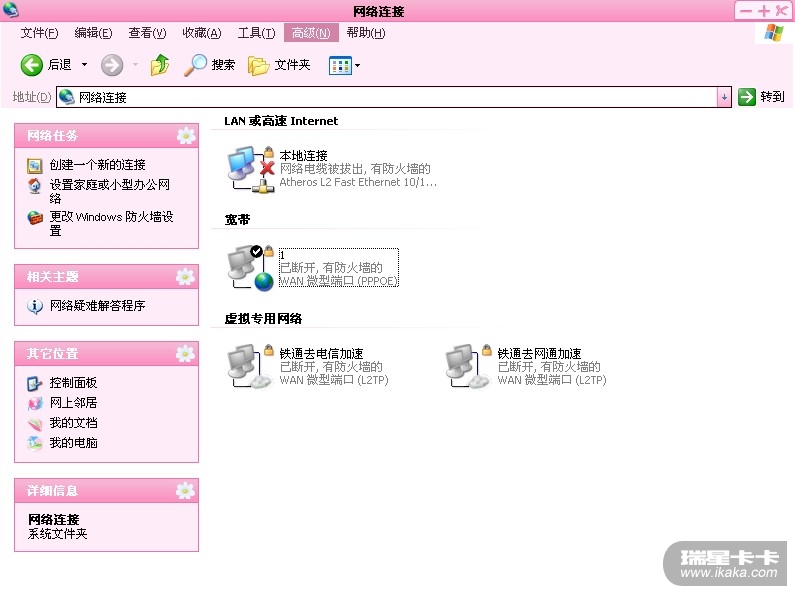 网上邻居里宽带连接图标旁有锁头标志,这个是正常的,是系统再带的防火墙
