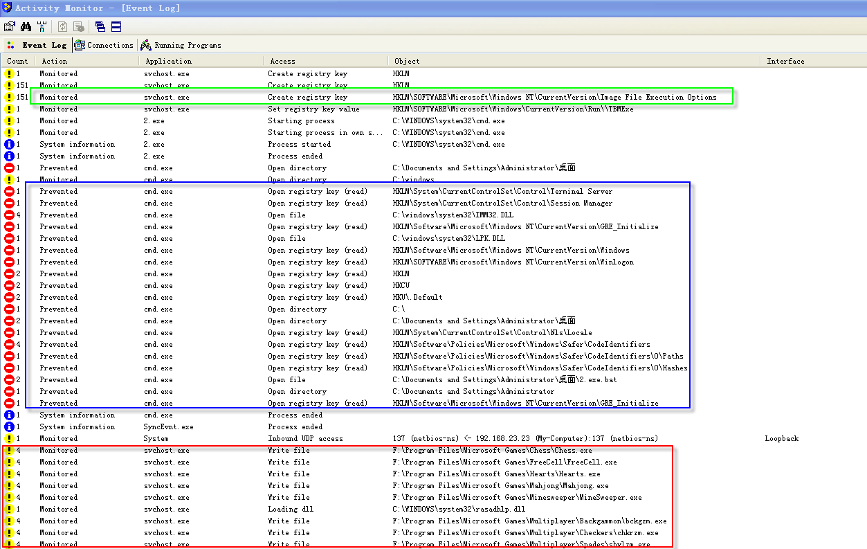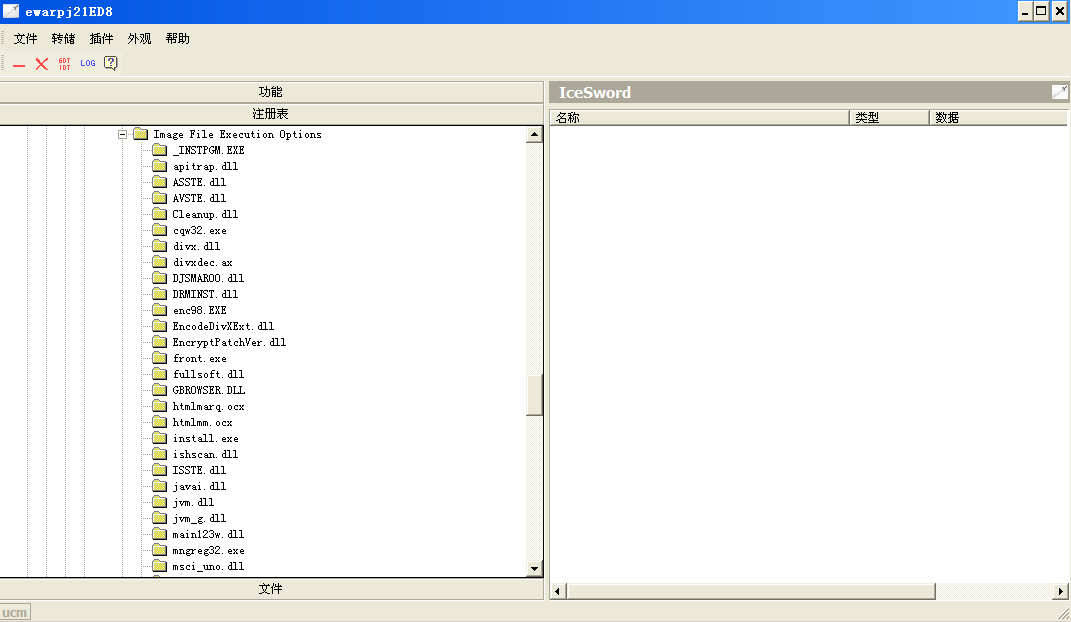 图1中蓝框显示的是:更动TINY的规则后病毒读写硬盘及注册表的动作受限;绿框显示的是:病毒的一个IFEO劫持动作没有漏监,但IFEO劫持项并未写入注册表内,且IceSword可以不受病毒影响,正常方式运行(见图2);红框显示的病毒的文件感染动作也没因此有漏监。
