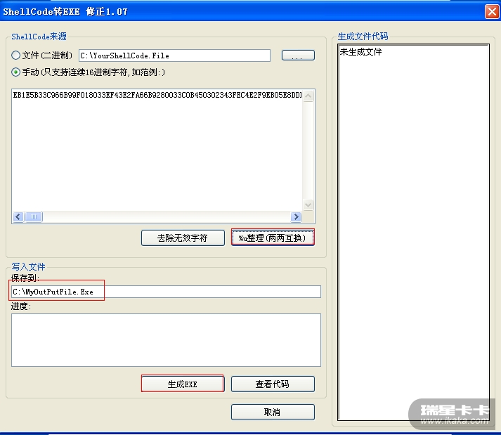 使用redoce工具将shellcode生成为exe程序,这里就不详细讲解了。详见下图: