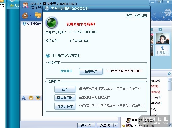 你可以把你信任的文件,添加到瑞星木马行为防御的白名单中尝试一下。
