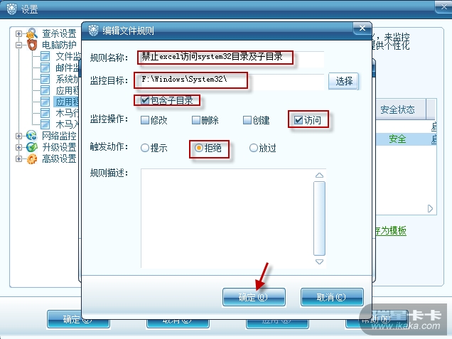 2、excel不属于病毒,防止它访问system32 目录的目的何在?楼主没说.