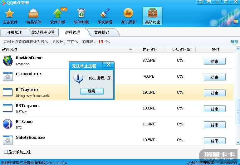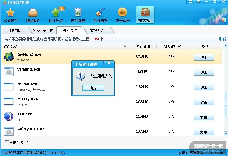我试了一下,使用QQ软件管理无方结束瑞星杀毒软件的俩个进程。