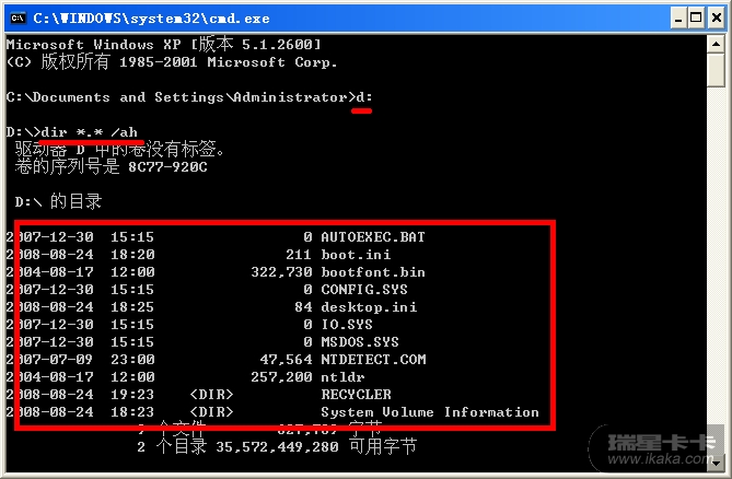 2、按照下图红线提示的字符依次输入,每输完敲一下回车,如果文件夹只是被隐藏,则在红框处可以显示出来(显示为“<DIR>”的项目就是被隐藏的文件夹):