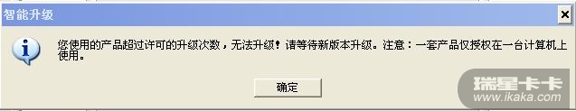 直接下载最新版本使用,一般出这种提示,是因为你的瑞星序列号有多人使用,或者在多个操作系统中使用,或者你重复安装瑞星,重复升级引起的,一般等到下一个版本升级的时候即可解决.注意,一套瑞星产品只可以安装在一个计算机的一个操作系统中,并且不要频繁重复安装,重复升级.