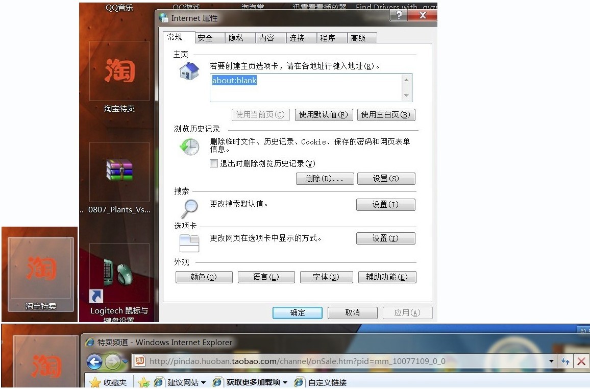 不知道什么时候开始就变这样了。用的是WIN7,IE图标变成了淘宝的图标。。。点进去属性是IE属性,看过去主页没有被改变,但是一点进桌面上的那个淘宝图标就连接到了图上的那个网址。。。删又不能删,改又不能改,瑞星跟卡卡等也没查出这个是流氓或