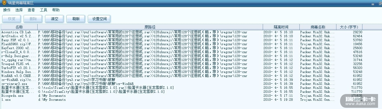我那个郁闷哪!大哥们,我要的是恢复方法,或者说瑞星不具备恢复大于隔离区的文件就行了,用不着绕过来绕过去。已经是这样了,还说什么应该删不删。还好老家还有备份,就这么的吧!