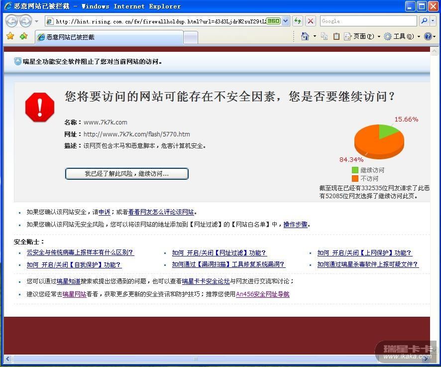http://www.7k7k.com/玩游戏了,今天想上去玩一会,谁知被瑞星全功能拦截报为恶意网址,记的我一个多月前访问时是正常的。谁知现在成了恶意网址了。是不是我的瑞星误报了,请楼下朋友也来测试下吧。我的瑞星是最新版。主程序版本:22.00.03.53