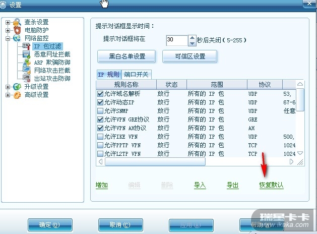 ip规则设置应该经常升级一些规则,而不应该把这些交给用户,毕竟用瑞星是为了防护,而不是为了玩杀毒软件的