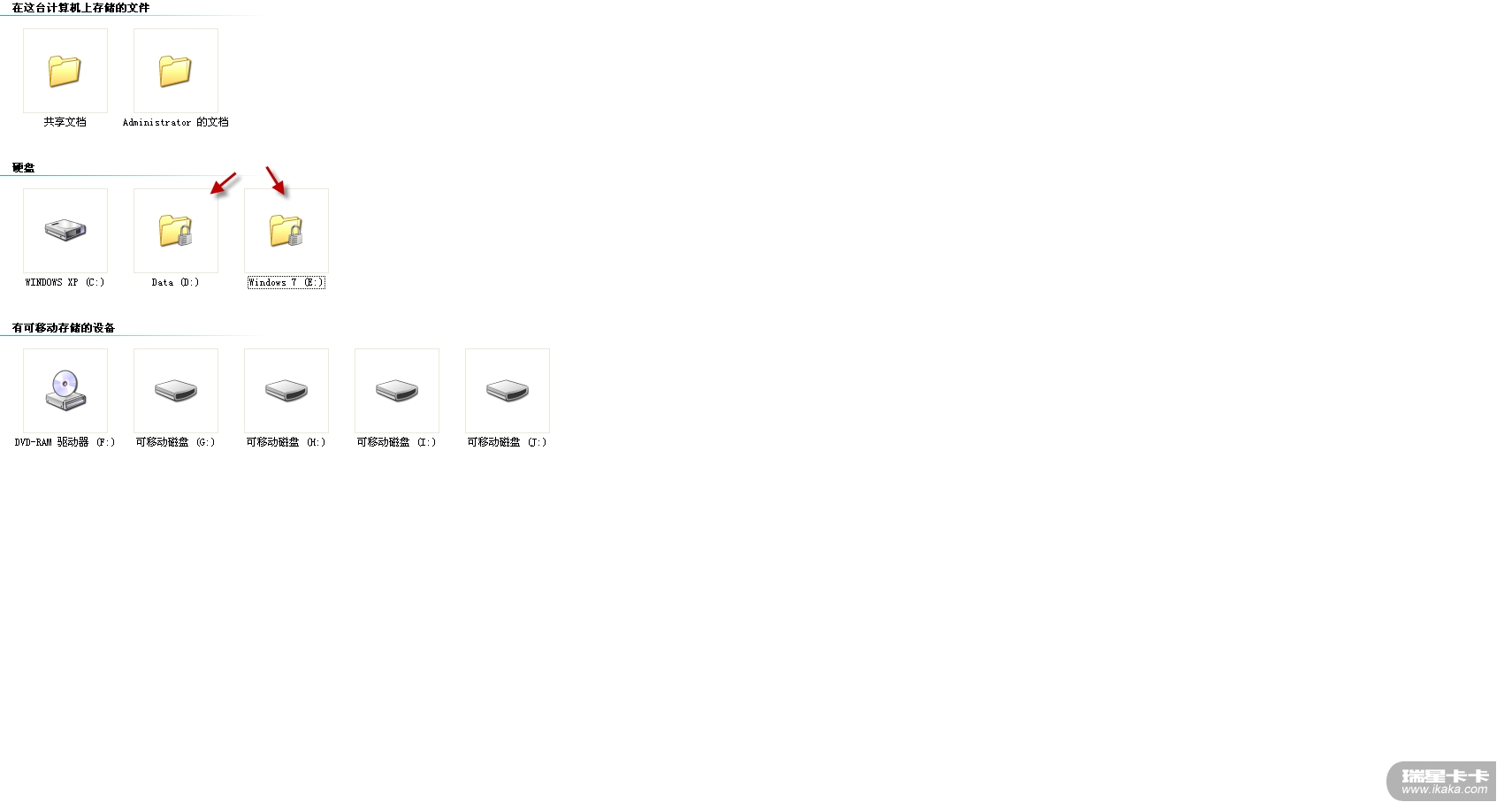 XP系统中,被保护的非系统分区显示成“带锁的文件夹”: