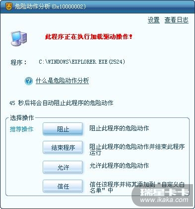 在登录网上银行(浦东发展银行)时,在焦点移到密码输入框时,瑞星弹出“危险动作分析”对话框个,说c:\windows\Explorer.exe正在执行加载驱动操作!推荐阻止,但是以前一直都是这样用的,没出现这样的现象啊?我讲这个文件作为可疑文件提交,结果是安全文件?那为什么会这样提示?