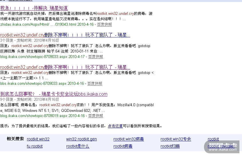 我的 问题 也一样, 在玩 龙腾世界,已经玩了一天了,由于游戏卡,退出重进,瑞星就报了 rootkit.win32.undef.cry,可查不到病毒信息,进入游戏 就被龙腾所谓的 反挂系统 踢出来,问题是 我没有过外挂与脚本,但瑞星关闭后就可以登陆游戏。