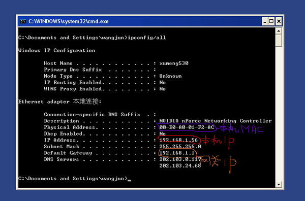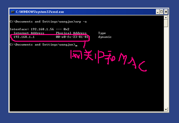 本机IP与MAC的对映关系。具体的值各用户会有不同。请不要照以上完全抄写!如何查看本的IP与MAC以及网关的IP与MAC以下将做介绍。)