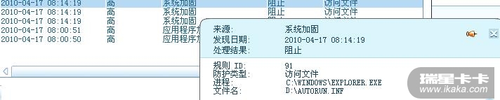 就算没有autorun.inf文件,系统自身的桌面进程也是会执行访问autorun.inf文件的命令的,2010瑞星的主动防御会常规性的阻止其访问autorun.inf文件的企图,并记录日志,哪怕没那autorun.inf文件,也一样阻止一次并记录日志。 也就是阻止并记录一次桌面程序的访问autorun.inf文件的命令。