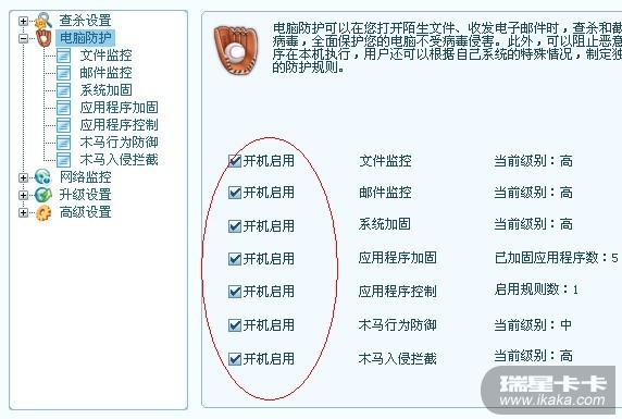 看看设置里电脑防护右边的勾是否都打上了,没打上就全部打上吧,如果已经打上了就尝试在程序里找到瑞星,修复,试一下吧.