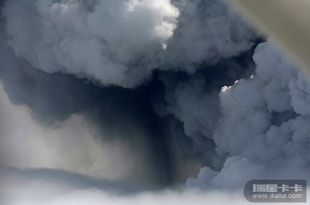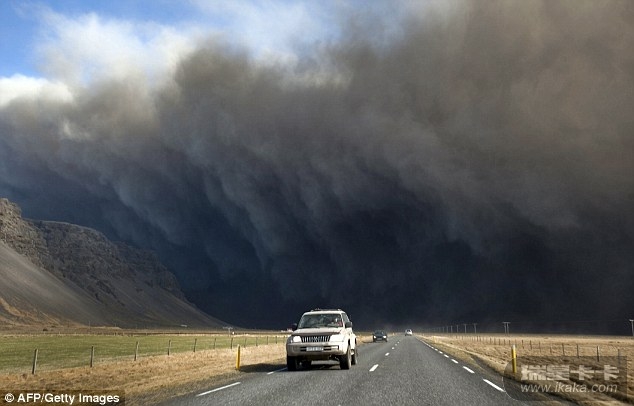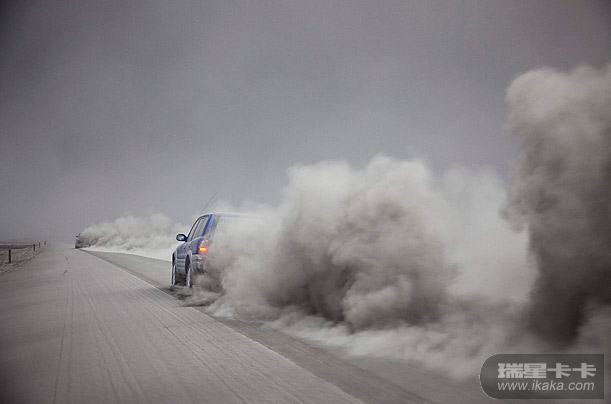 在冰岛火山继续喷发火山灰时,汽车上的乘客感觉后方的黑雾滚滚而来。黑云遮蔽了蓝色的天空,形成的龙卷风扫过地面。