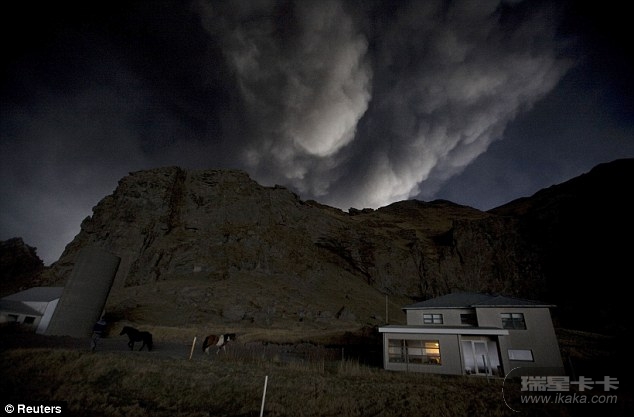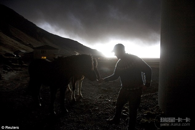 火山灰形成的云雾飘过冰岛一处家庭农场的上空。