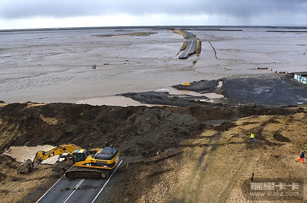火山喷发使Markarfljot冰河上的一条道路被毁。