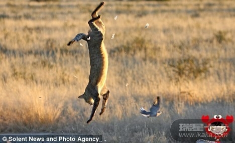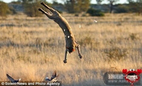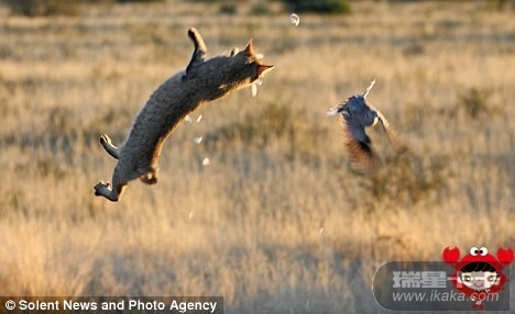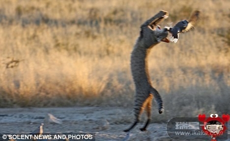34岁的摄影师 Jaycee Rousseau 和妻子驾车驶过位于南非和博茨瓦那的卡拉哈迪跨国野生动物保护公园时,远远望见水池旁悠闲觅食的环颈鸽,他们正打算离开时突然见发现一只非洲野猫杂技般地搞定一只小鸽,他按下快门: