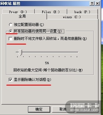 我的操作系统是vista,各分区回收站设置本身就是独立的,注意红框处的两个选项,只能供参考了: