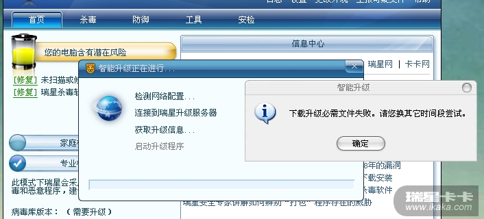 为什么我的瑞星不可以升级,上午还好好的,下午我回来就不可以了,打开瑞星上面提示要升级,但我打开他说什么下载所需升级的文件失败,