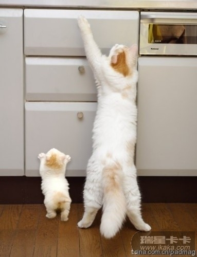儿子,待会猫粮掉下来后,你叼着就跑~