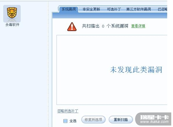 杀毒软件提示的漏洞包括卡卡中的:系统漏洞,非安全更新,可选补丁,第三方软件漏洞,已忽略补丁。