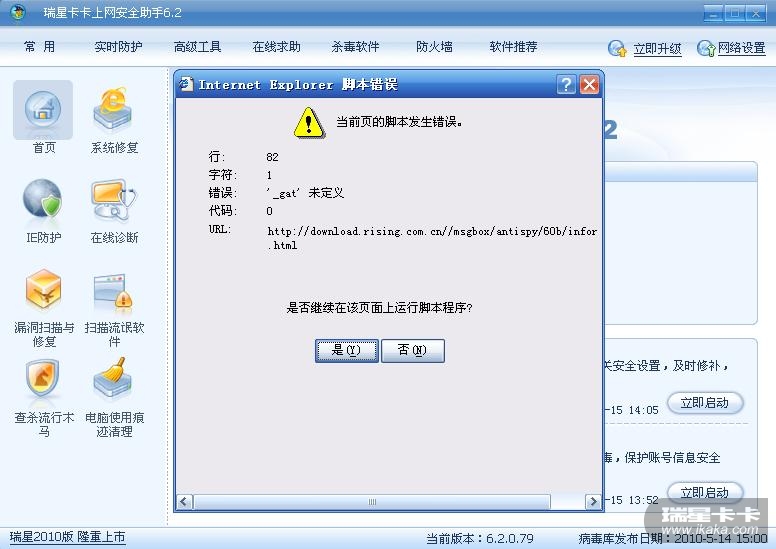 ),安装的过程中,请注意留下您的真实邮箱,以便我们在必要时与您取得联系。 打开安装好的卡卡上网安全助手,按照如下提示操作: 1.进行恶意软件清理:依次点击『常用』--『扫描流氓软件』,然后点击『立即清理』进行描流氓软件清理。 2.清理临时文件:依次点击『常用』---『电脑使用痕迹清理』,请全部选中后立即清理。然后再打开卡卡后观察是否有报错。