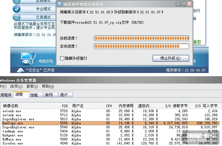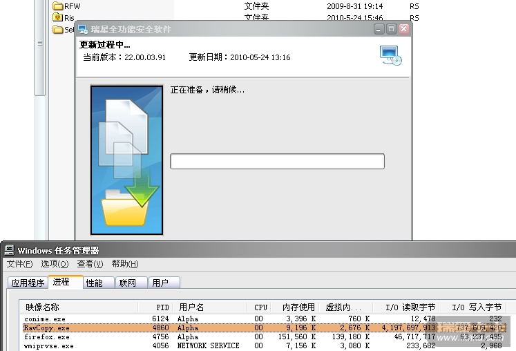 升级过程中测得Rising文件夹约330MB,Application Data文件夹约200MB,Local Settings文件夹约600MB,升级结束后基本相同。