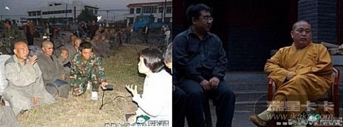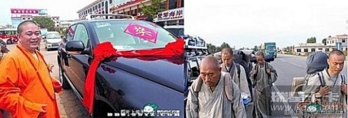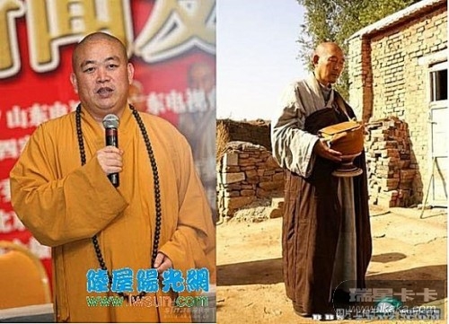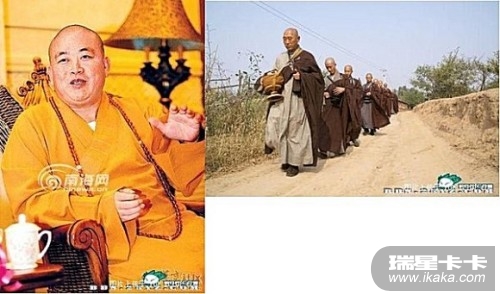 养尊处优,衣着鲜亮的少林寺方丈释永信和遵循戒律,日中一食、过午不食,行脚途中全部托钵乞食的大悲寺僧众的对比