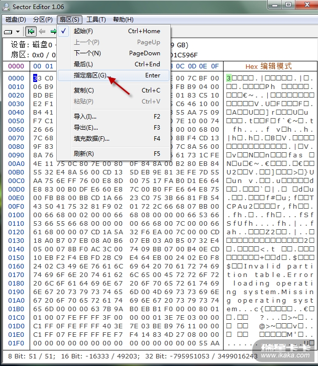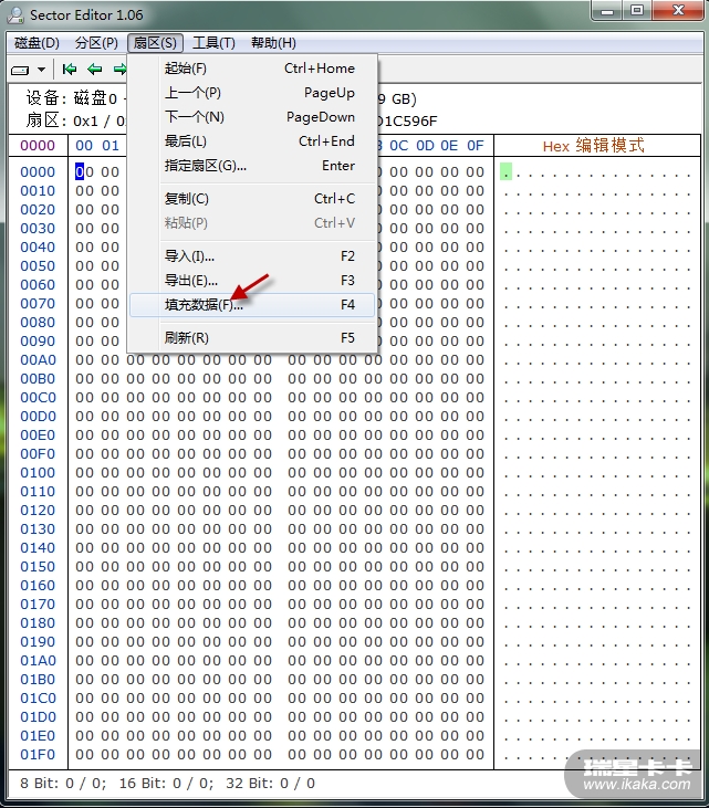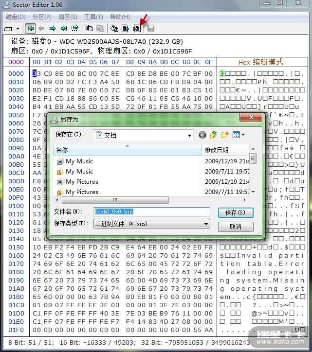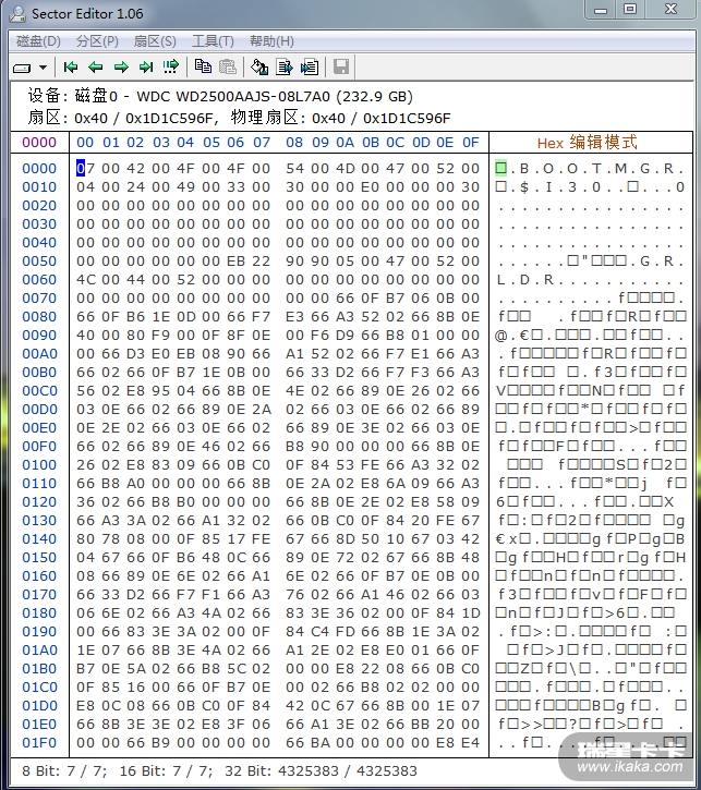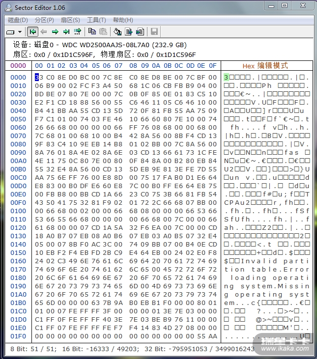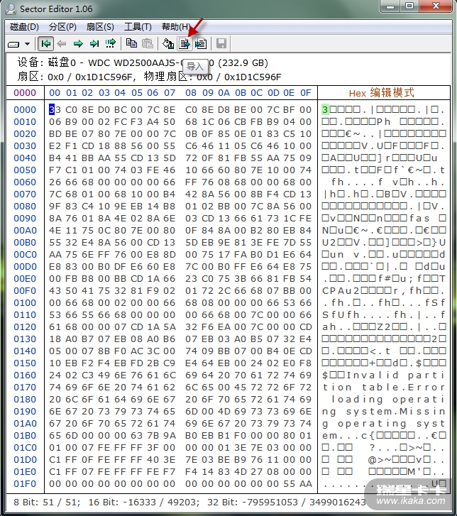 因此,对我这台电脑而言,仅需用Sector Editor导出0扇区以及61-63扇区内容即可。导出的内容既是备份。以后需要恢复引导区时,用Sector Editor将相应内容分别导入0扇区以及61-63扇区;其它扇区统统填0即可。