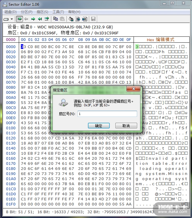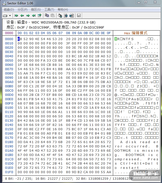 提示:Sector Editor为硬盘扇区直接读写工具。操作时务必仔细小心。误操作而不能及时发现/纠正者,下次开机时,可能导致系统不能引导。每个人的电脑装安装的操作系统和软件不同,引导区的内容就不相同。有些应用软件(如:powershadow 2.6及其更老的版本)也写引导区。因此,系统干净时,备份引导区前,应先查明自己电脑硬盘引导区的基本情况。