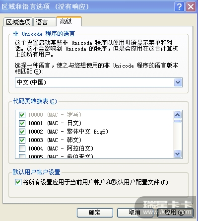 控制面板\区域和语言选项\高级中默认用户账户设置对勾选上后一应用就显示区域和语言选项没有响应,请高手帮帮忙啊!!!!!!!!!!
