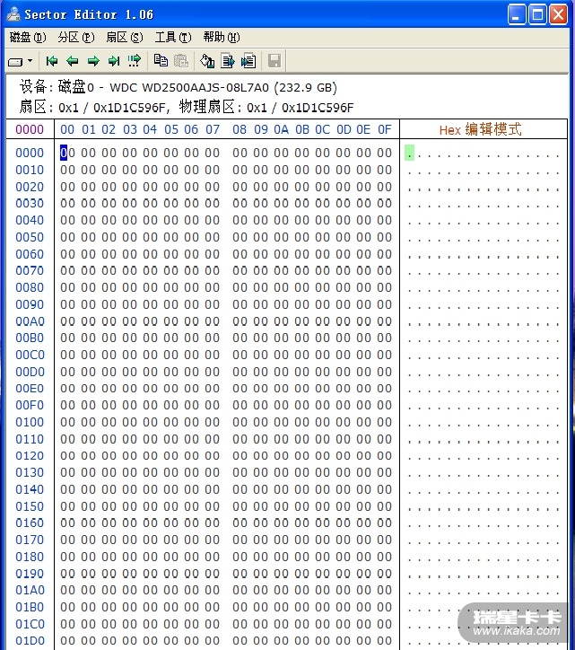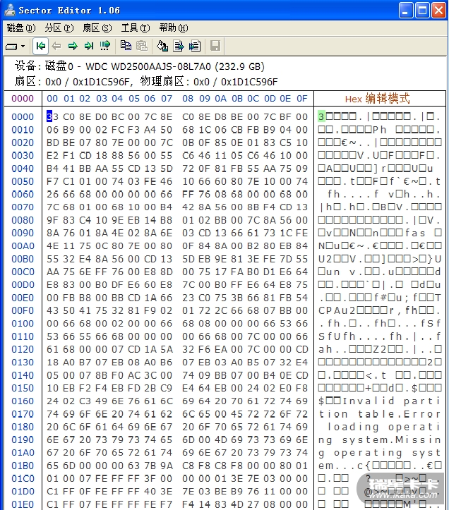 3、重启系统到XP下,再次查看MBR及后续扇区,正常。