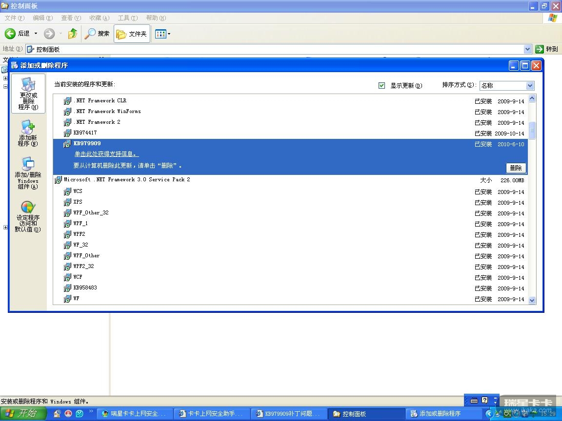 楼主可以在控制面版的添加删除程序中卸载掉这个KB979909补丁,然后再在添加删除程序中卸载:Microsoft .NET Framework