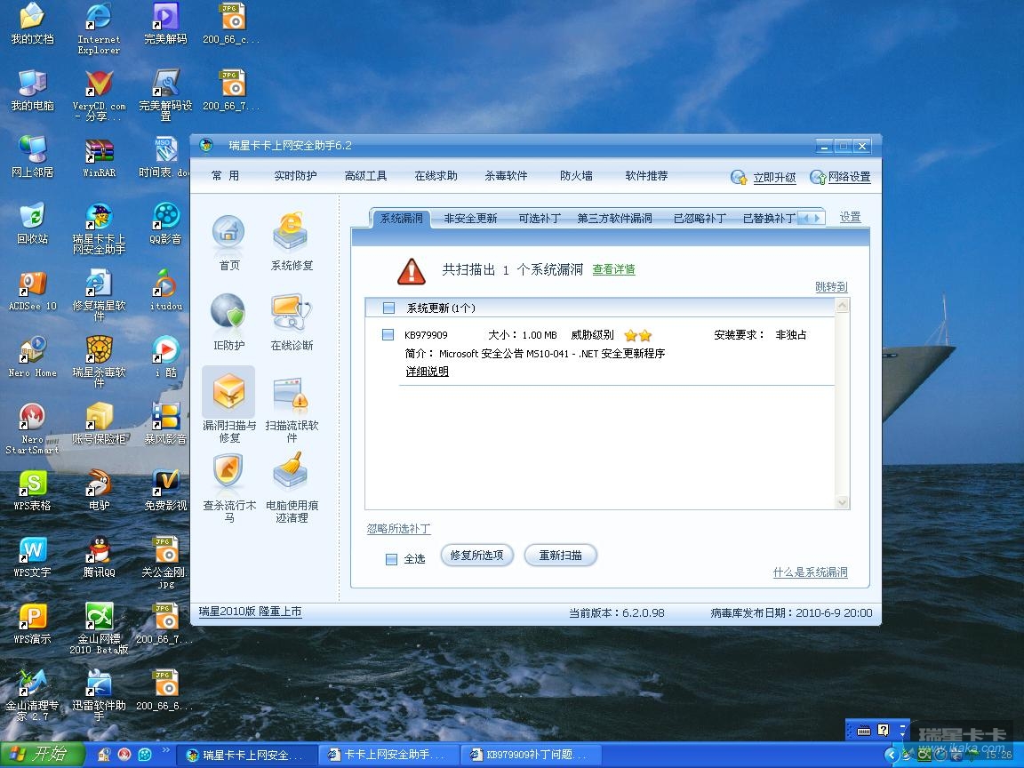 另外我的漏洞库版本是2010.06.02.1的2.7.5版的金山清理专家也未发现有kb979909的补丁未安装,数次扫描都是100分。