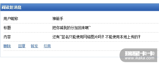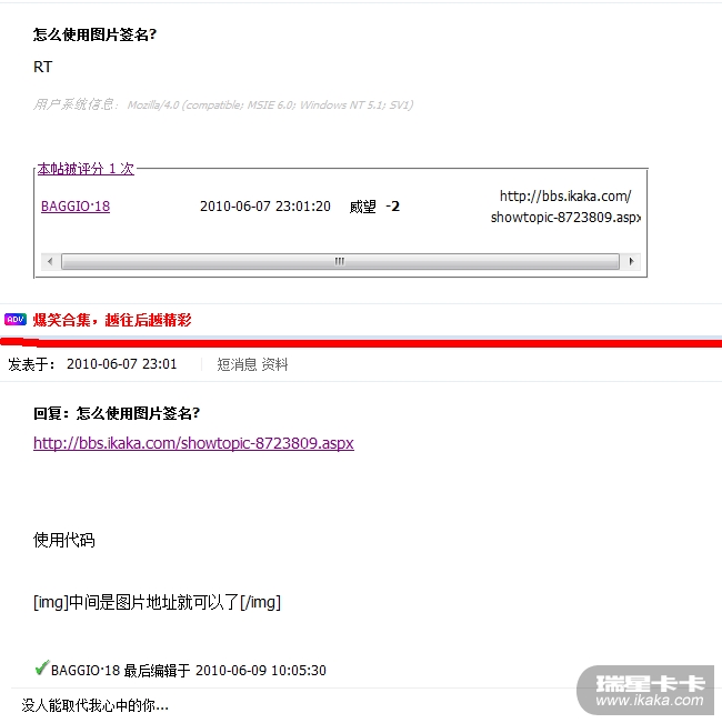 http://bbs.ikaka.com/showtopic-8723654.aspx http://bbs.ikaka.com/showtopic-8723927.aspx http://bbs.ikaka.com/showtopic-8723809.aspx 和鉴于第一条最后一个.可以明显看到img代码可用..还是在站务又重新开贴.我当时认为.楼主没有很认真的看他第一帖子回复他的那个人的截图导致.所以才扣分.并且同时加上第一个帖子连接(如图)
