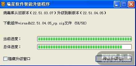 我是瑞星升级每次都是一到这个进度就停了,硬盘灯一直闪烁,好像是检查完组件,开始下载病毒库了吧~,要等十几钟吧~~汗呀~我的是2010版,最近才出现这种情况~~我还安装了瑞星的防火墙,升级很快,没这个现象;请高手解答;是不是瑞星升级服务器调整了呀~我用的是铁通~谢谢了,我已经卸载重装过了~~还是这样~~