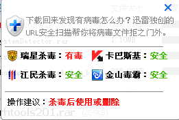 瑞星在迅雷安全扫描中查杀结果,很有悲剧色彩的是卡巴斯基、金山、江民都提示为安全文件。