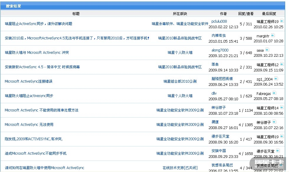 关于Microsoft ActiveSync 无法使用的问题,论坛从09年10月左右,就有用户提出了这个问题,并希望瑞星得以解决~现在已经是2010年了~~这个问题依旧没有得到解决,瑞星的工程师每一个回复都是,我们已经收集相关问题,提交相关部门~~马上就是2年了~~这个问题提交得可真久!